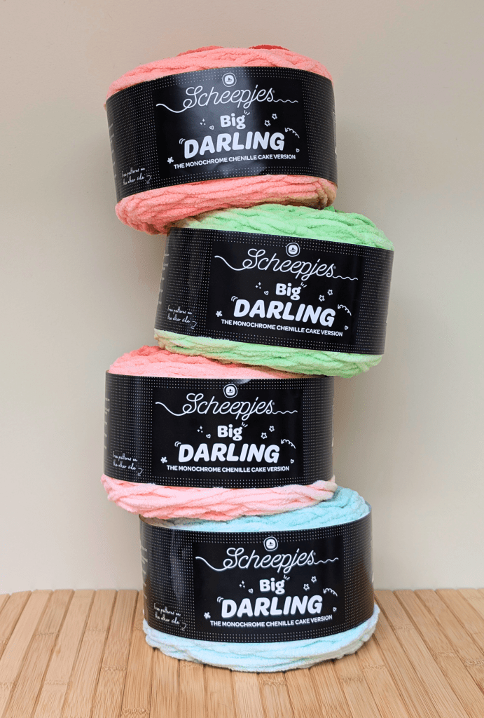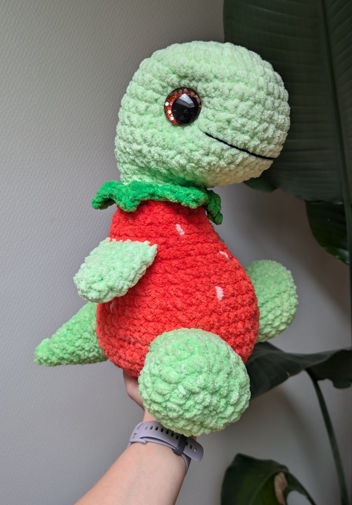 I created Sally the Strawbasaur to celebrate the release of Big Darling by Scheepjes, a soft, gradient chenille yarn that works beautifully for plushies. The gentle colour changes flow naturally as you crochet, which means you can achieve a multi-coloured look without having to switch yarns or weave in extra ends. Because of this gradient effect, you only need two skeins of Big Darling to make Sally, instead of the four separate colours you would normally use. As the larger version of the earlier Little Darling yarn, it has the same cosy texture and ease of use, just in a bigger, more huggable size.